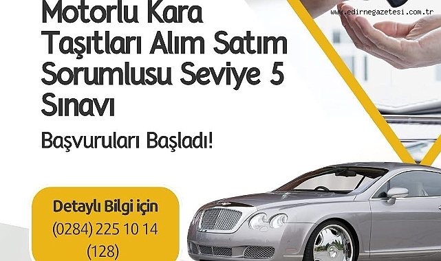 Edirne Ticaret ve Sanayi Odası, Türkiye Odalar ve Borsalar Birliği MEYBEM A.Ş. iş birliğiyle düzenlenecek Motorlu Taşıtları Alım Satım Sorumlusu Seviye 5 sınavının, Edirne Ticaret ve Sanayi Odası’nda gerçekleşeceğini bildiren bir paylaşım yaptı.