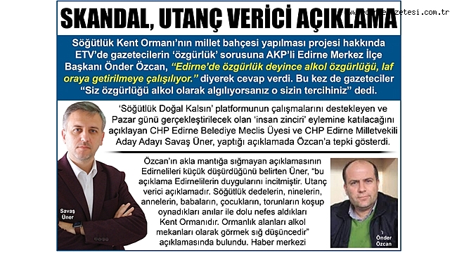Söğütlük Kent Ormanı’nın millet bahçesi yapılması projesi hakkında ETV’de gazetecilerin ‘özgürlük’ sorusuna AKP’li Edirne Merkez İlçe Başkanı Önder Özcan, “Edirne’de özgürlük deyince alkol özgürlüğü, laf oraya getirilmeye çalışılıyor.” diyerek cevap verdi. Bu kez de gazeteciler “Siz özgürlüğü alkol olarak algılıyorsanız o sizin tercihiniz” dedi.