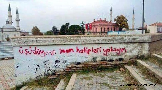 Edirne’de kimliği belirsiz kişiler tarafından Selimiye Cami meydanına sprey boya ile “Üşüdüysen imam hatipleri yakayım” yazısı yazıldı. Gece geç saatlerde yazıldığı tahmin edilen yazıyla sabah saatlerinde karşılaşan vatandaşlar yazıya tepki gösterdi.Edirne Müftülüğü ve Mimar Sinan’ın ustalık eseri olan Selimiye Cami meydanındaki duvara kasıtlı olarak yazıldığı iddia edilen yazılara tepki gösteren Edirneliler, “ Serhat şehri Edirne’de bu gibi yazıların yazılması gerçekten biz Edirne halkını üzüyor. İmam Hatiplere karşı yazılan bu yazı adeta İmam Hatiplere bir saldırıdır. Bu yazı en kısa sürede yetkililer tarafından buradan silinmeli ve bu yazıyı yazanlar bulunup cezalandırılmalıdır” ifadelerine yer verdiler.