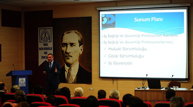 Edirne Makine Mühendisleri Odasında gerçekleştirilen seminerde Lütfi İnciroğlu, iş güvenliği uzmanlarına kamu ve özel sektörde görev yapan iş güvenliği uzmanlarının yaptıkları iş ve işlemlerle ilgili hangi hukuki işlemlerle karşı karşıya kalacakları konusunda çeşitli bilgiler verdi.