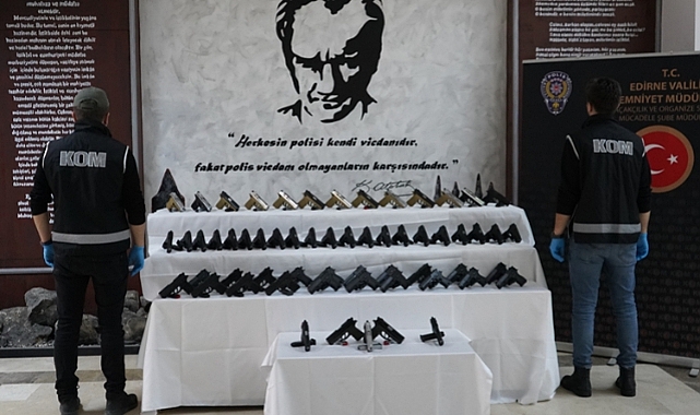 Edirne Emniyet Müdürlüğünden yapılan açıklamaya göre, Kaçakçılık ve Organize Suçlarla Mücadele Şube Müdürlüğü ekipleri, uluslararası silah kaçakçılığı suçuna yönelik çalışmaları kapsamında sınır kapısında Bulgaristan vatandaşı Y.I.D. ve eşi N.N.D'nin otomobilini durdurdu. Yapılan aramada otomobilin farklı yerlerine gizlenmiş 59 ruhsatsız tabanca ve 59 şarjör ele geçirildi. Gözaltına alınan şüphelilerin emniyetteki işlemleri devam ediyor. AA